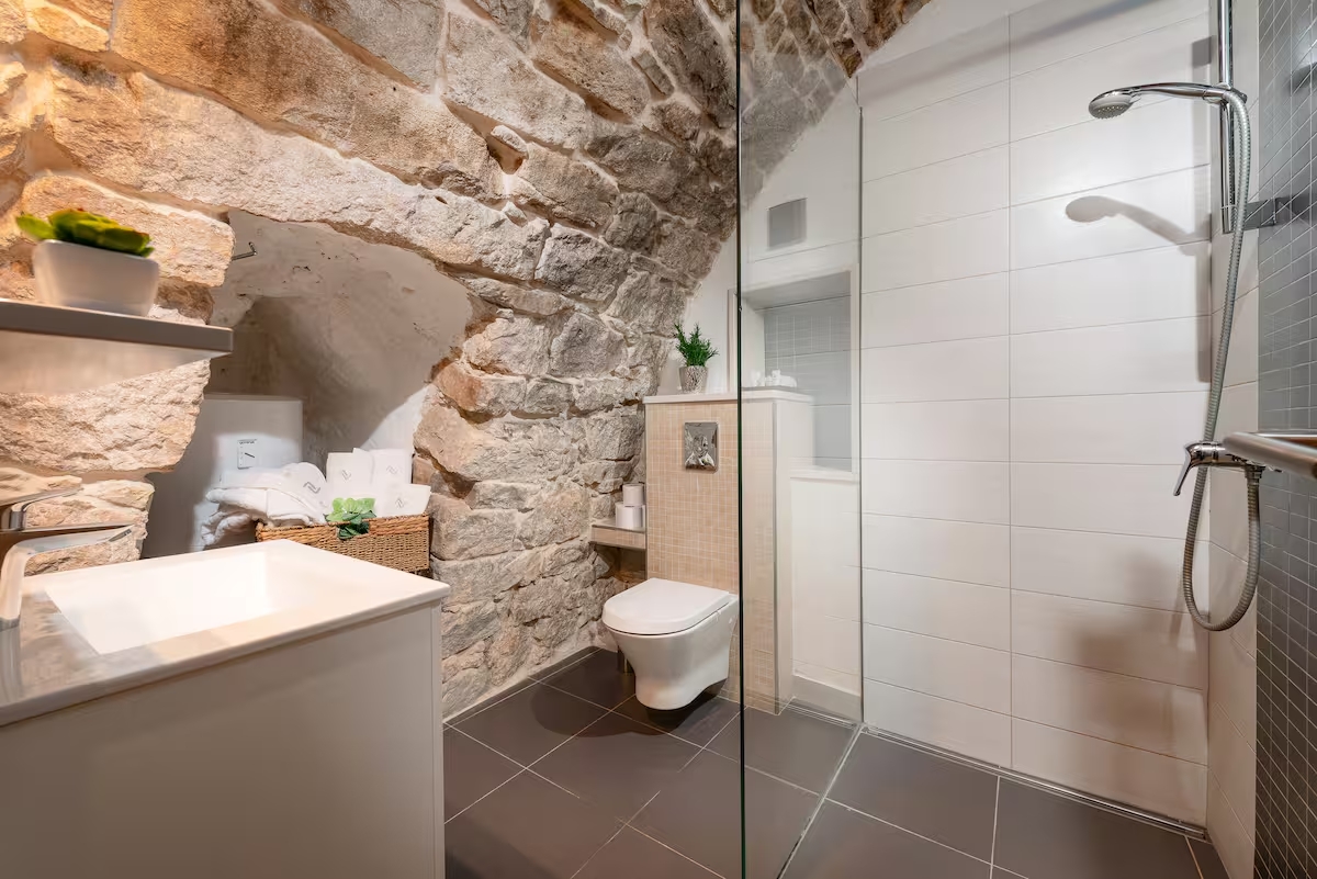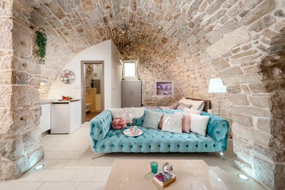 How about sleeping in a piece of history? You can do it in this Airbnb appartement, carved from a 200-year-old wine cellar, reminiscent of those beneath Diocletian’s Palace, just five minutes away. Nestled on the ground floor of a 19th-century Croatian stone house, it retains authentic Dalmatian charm, with cool stone walls that keep you comfortable in summer and cozy warmth in winter. Playful touches, like a velvety aqua-blue sofa, complement traditional arcaded ceilings and cavernous stone interiors, creating a space full of character.